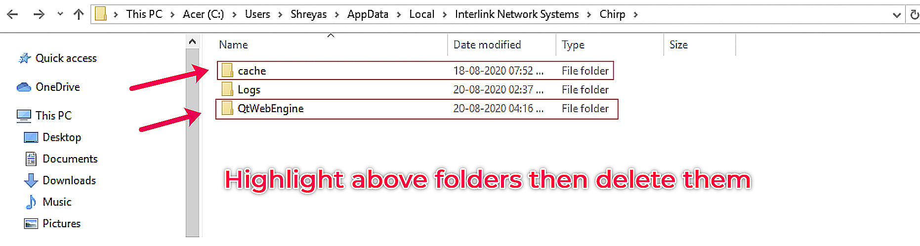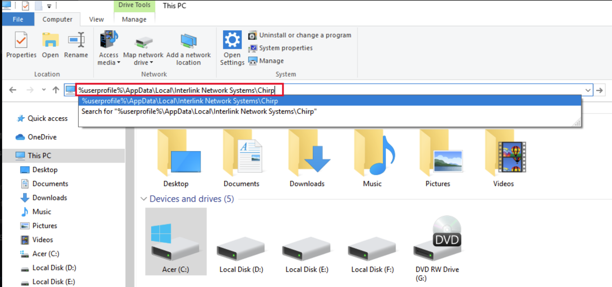 Step 2: Open File Explorer in windows and open %userprofile%\AppData\Local\Interlink Network Systems\Chirp