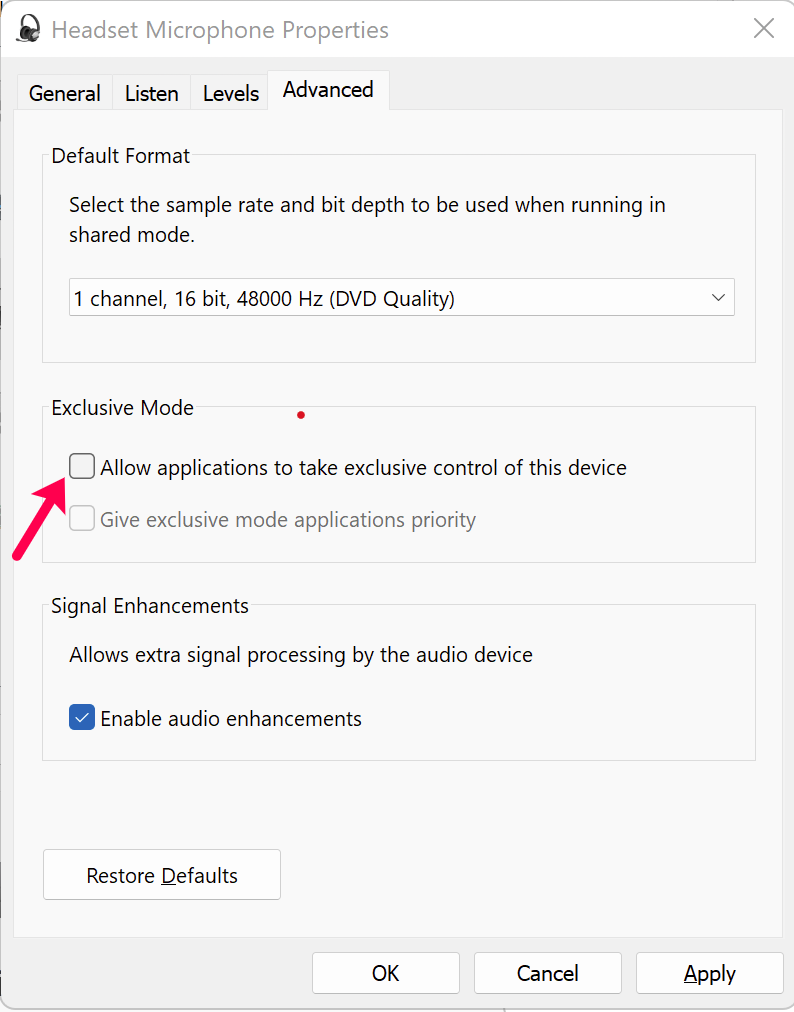 Now click on the Advanced tab, and ensure the box Allow Applications To Take Exclusive Control of Your Application is unchecked, this will stop applications mistakenly adjusting your mic settings.