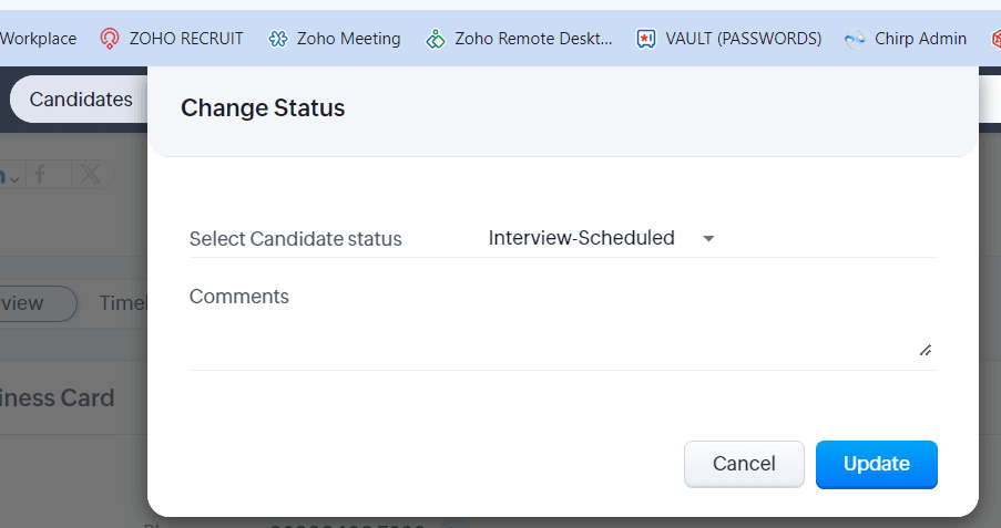 Once everything is set, go to Zoho Recruit and change the status to “Interview Scheduled” and update the notes on the candidate profile for the interview schedule.