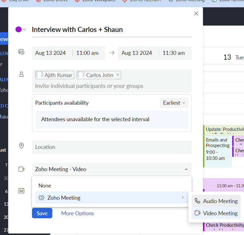 Add the candidate’s email address, and select Zoho Video Meeting on the Conference field. And then click Save. This will automatically send a meeting invite to the candidate.